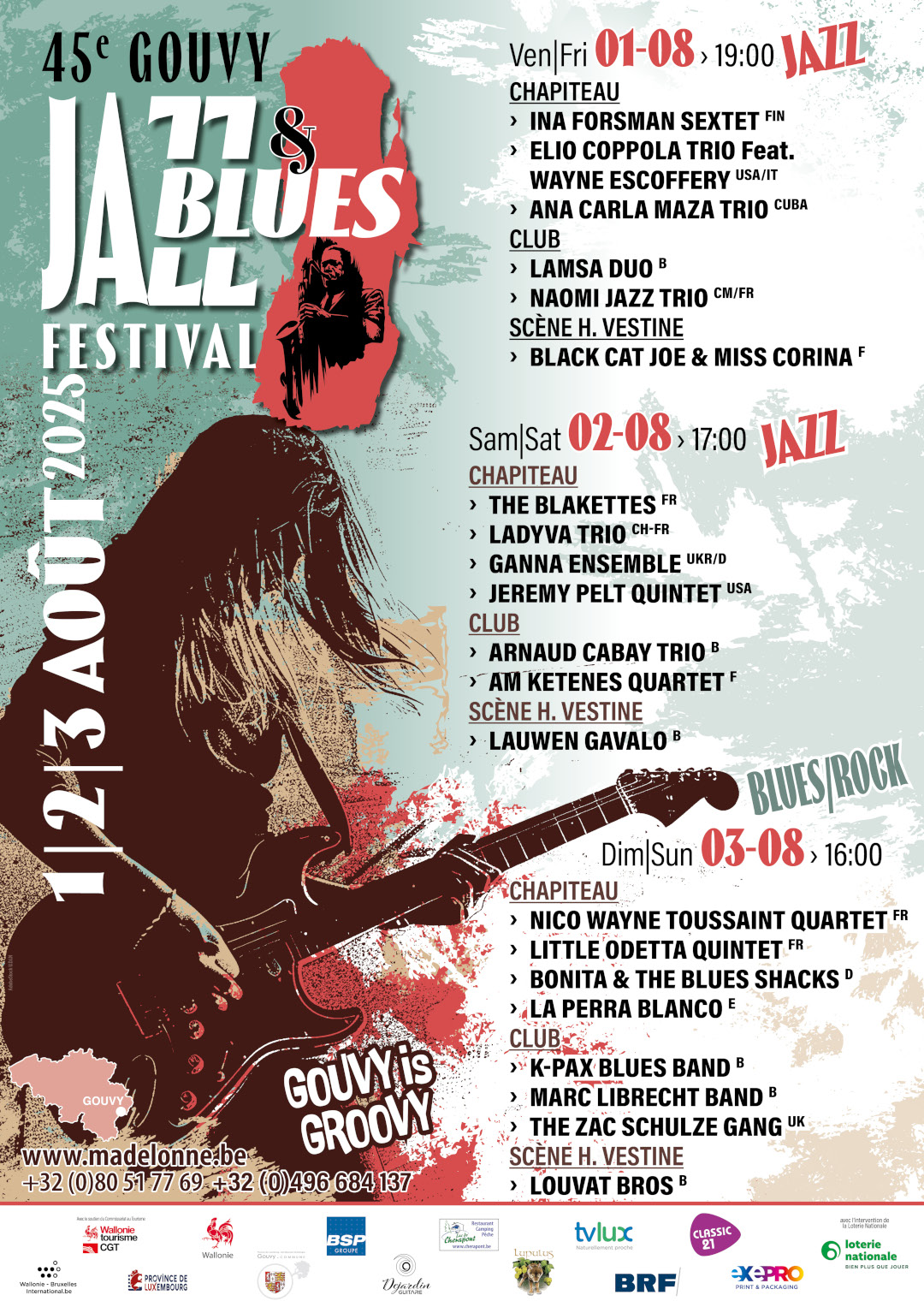 LA PERRA BLANCO (Spain) / K-PAX BLUES BAND (B) / MARC LIBRECHT BAND (B) / THE ZAC SCHULZE GANG (UK) / INA FORSMAN SEXTET (Finland) / ANA CARLA MAZA TRIO (Cuba) / ELIO COPPOLA TRIO Feat. WAYNE ESCOFFERY (usa/it) / NAOMI JAZZ TRIO (Cameroun/Fr) / BLACK CAT JOE & MISS CORINA (Fr) / THE BLAKETTES (Fr) / LADYVA TRIO (Ch/Fr) / LAMSA DUO (B) / JEREMY PELT QUINTET (usa) / ARNAUD CABAY TRIO (B) / AM KETENES QUARTET (Fr) / LAUWEN GAVALO – GIPSY JAZZ / FRENCH MUSETTE (B) / NICO WAYNE TOUSSAINT QUARTET (Fr) / GANNA ENSEMBLE (Ukraine-Ger) LITTLE ODETTA QUINTET(Fr) / BONITA & THE BLUES SHACKS (Ger)